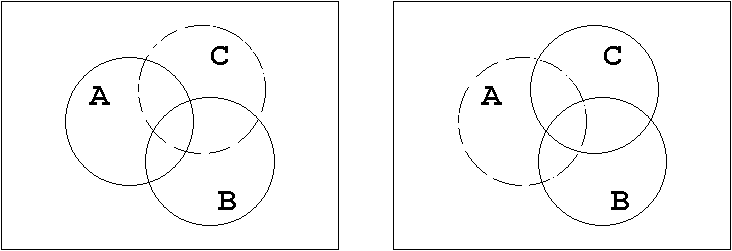 Es ist offenbar gleich, in welcher Reihenfolge die Mengen A, B und C disjunktiv ("+") bzw.