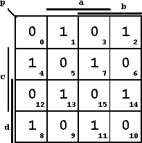 Abb. 2.42: KV-Diagramm der Booleschen Funktion zur Prüfung auf ungerade Parität.