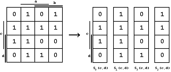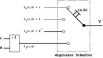 Die anschaulich am KV-Diagramm gezeigte Funktionszerlegung kann zu einer praktischen Schaltungsimplementierung führen, falls die entstandenen Terme Si(c,d) z.B. durch einen hypothetischen "Schalter" in Abhängigkeit von (a,b) auf die Ausgangsleitung Y = f(a,b,c,d) geschaltet werden können: