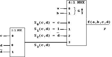 Die oben durch ein KV-Diagramm beschriebene Beispielfunktion, für die eine Schaltungsrealisierung gesucht wurde, kann jetzt offensichtlich mit Hilfe eines Multiplexers implementiert werden: