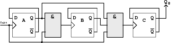 Die asynchrone Organisation stellt erneut die Realisierung mit dem geringsten Aufwand dar. In diesem Fall sind allerdings die auftretenden Zwischenzustände ungefährlich, da sie nicht ausgegeben werden.