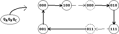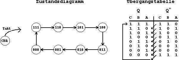 Abb. 7.24: Zustandsdiagramm und Übergangstabelle des 23-Teilers.