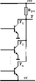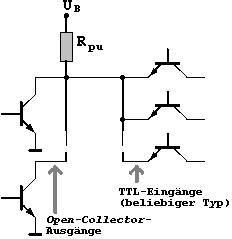 Bei Gattern mit Open-Collector-Ausgang fehlt der bei Standard-TTL-Gattern integrierte Kollektor-Widerstand RC. Das Zusammenschalten mehrerer Ausgänge dieser Art ist jetzt möglich, wenn über einen gemeinsamen externen Widerstand eine Verbindung zur Versorgungsspannung hergestellt wird (pull-up-Widerstand). Dadurch ensteht die Möglichkeit sogenannte "Bussysteme" zu bilden, d.h. Ausgangssignale an einer Sammelleitung (bus) zusammenzuschalten (s.u.).