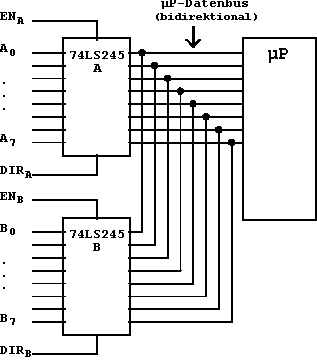 Abb. 9.30: Verbindung zwischen einem 8-Bit-Mikroprozessorbus und zwei externen Einheiten A und B.